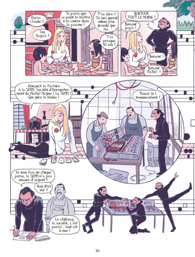 Romain Ronzeau, dessinateur de la série Espions de famille, met en musique ce biopic. Dans un style à mi-chemin entre Moynot et Vivès, il fait défiler la vie de Michel Magne, intégrant parfois des photos d’époque. Des fastes du château jusqu’à parodier Le repas de noce de Brueghel l’Ancien à la déchéance dramatique d’un homme blessé dans son âme, Ronzeau compose l’album en posant des cases sur une portée comme le faisait Magne avec ses notes.