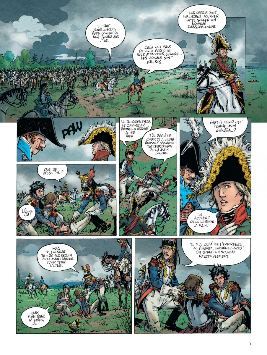 « La Bataille » est une adaptation par le scénariste Frédéric Richaud d’un roman de Patrick Rambaud qui a reçu le Prix Goncourt en 1997. Honoré de Balzac avait juré d’écrire un livre sur la bataille d’Essling, mais il ne rédigea que les premières lignes. Son déroulement fût apocalyptique : 45.000 morts et autant de blessés. Pour certains, c’est une victoire autrichienne. Pour d’autres, c’est un match nul car les deux armées se sont retrouvées sur leurs positions d’avant. Richaud réussit là où Balzac s’est cassé les dents. Ce dernier opus conclut cet affrontement démentiel. On peut parler de chef d’œuvre grâce au scénario très bien documenté mais aussi au dessin d’Ivan Gil qui apporte l’indispensable avec ses scènes d’action et des plans en profondeur suivis de zooms. La mise en couleurs d’Albertine Ralenti est superbe. On assiste médusé à la fin de la bataille avec une plaine couverte de cadavres. Les soldats restants n’en peuvent plus et se donnent la mort. A Vienne, pas loin, on observe la bataille qui laisse beaucoup d’indifférents. Alors, la fête bat son plein. Le lecteur s’attend à la fin de la bataille, mais n’en rate pas une miette.