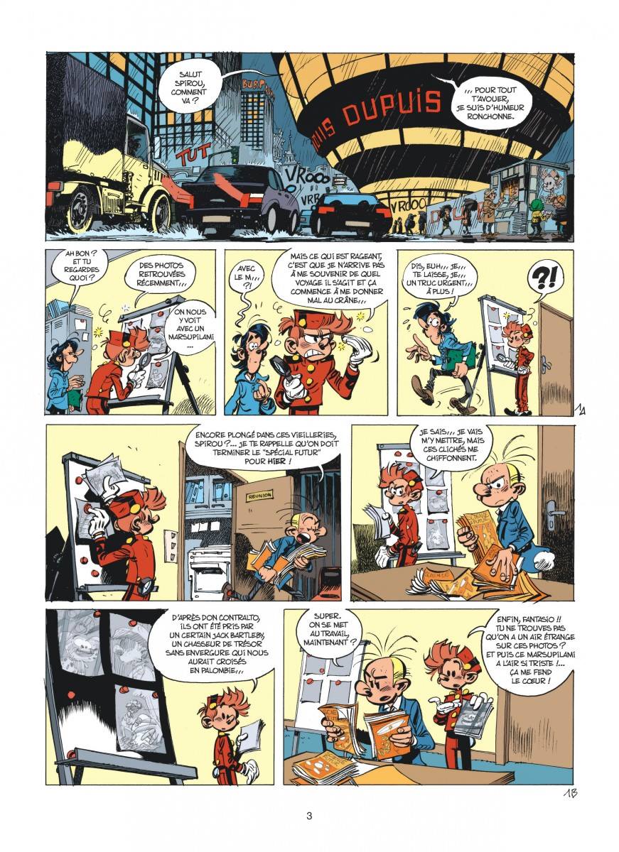Une des particularités de la reprise de Yoann et Vehlmann est la justification du costume de groom de Spirou et la mise en abîme régulière de la série par rapport au journal dont elle est issue. Pour preuve, la scène où Fantasio, groggy dans une pirogue sur un fleuve déchaîné de Palombie, s’imagine au bureau en train de présenter un numéro spécial Marsupilami d’un magazine, ou encore cet échange par webcam avec un personnage de l’univers franquinien qui intègre seulement pour la deuxième fois la galaxie Spirou. (Si ce n’est pas du teaser…)