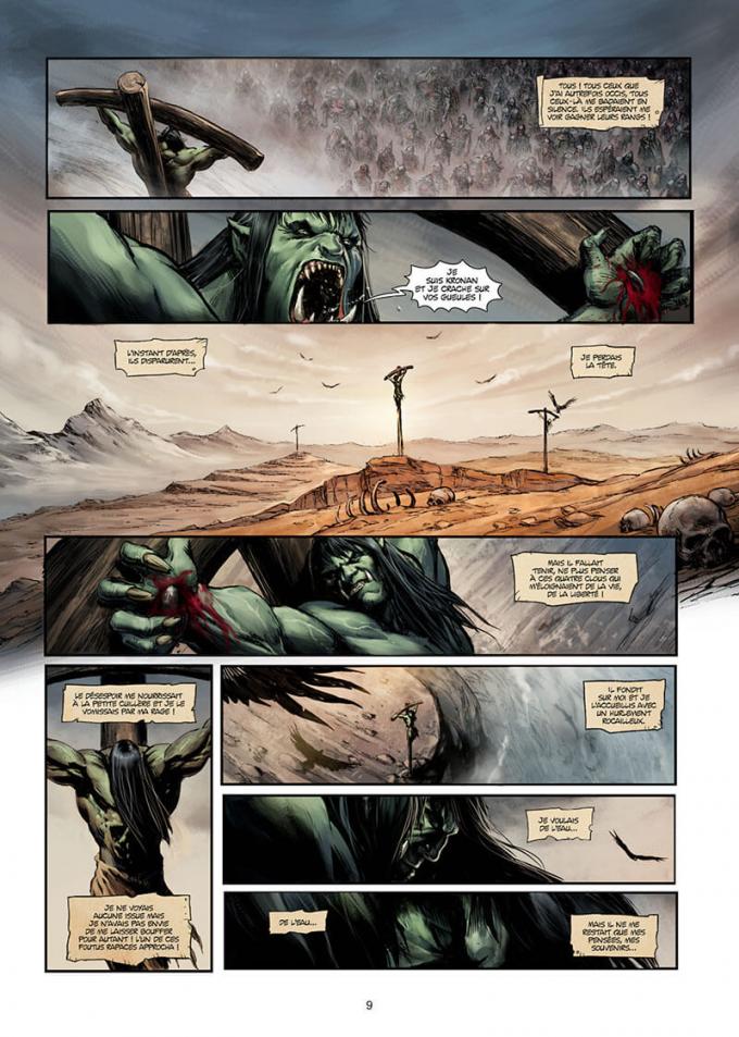 Le précédent tome d’Orcs et Gobelins, Dunnrak, était un hommage non dissimulé à un certain Hobbit et à un non moins certain anneau. Ce onzième volume est officiellement inspiré d’une nouvelle de Robert E.Howard, père du plus célèbre barbare de la littérature. Enlevez le « R » au patronyme de l’orc titre et vous aurez tout compris. Kronan-Conan, le parallèle n’est pas compliqué.