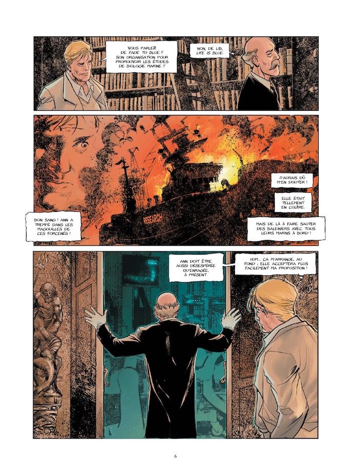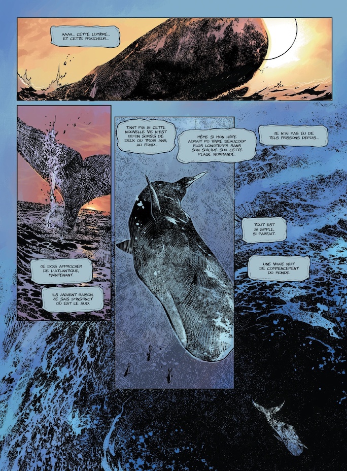 Par ailleurs, cette adaptation bédéesque ne serait pas aussi intense et prenante sans le talent graphique de Stefano Martino. Son trait, sa technique de hachures et ses couleurs font merveille, tout comme son découpage des planches. Assurant à chacune d’elles son ambiance intimiste grâce à une palette allant du rouge sang au bleu-noir des profondeurs, Stefano Martino soigne ses scènes en se libérant d’un cadrage trop « classique », trop réducteur des grands espaces abyssaux. Cette liberté lui évite ainsi l’emprisonnement d’une narration à fleur de peau dans des cases réductrices.