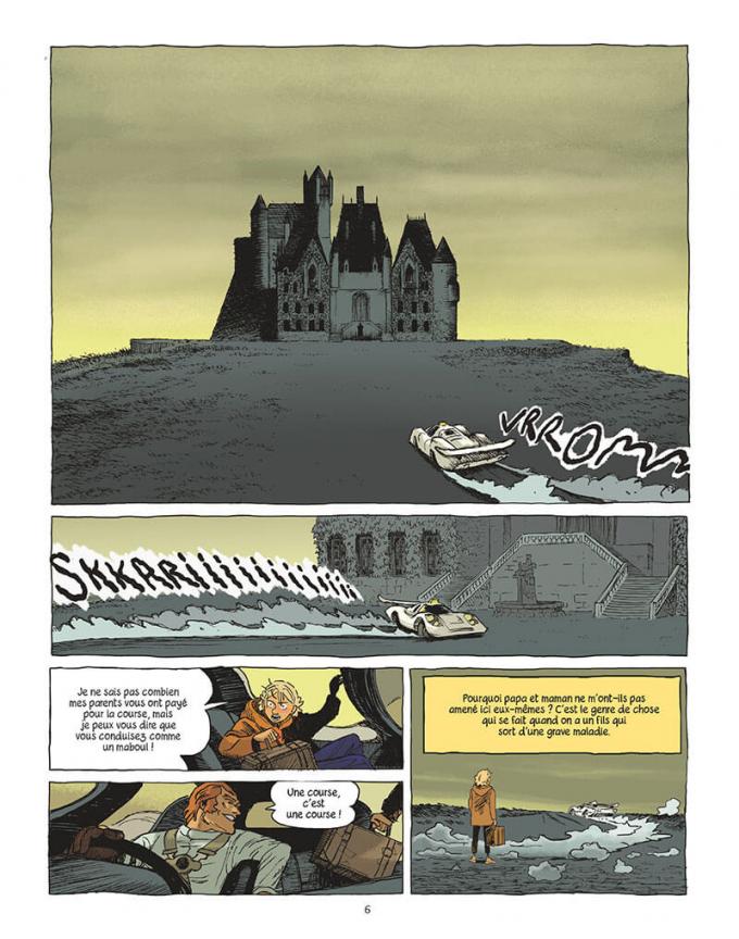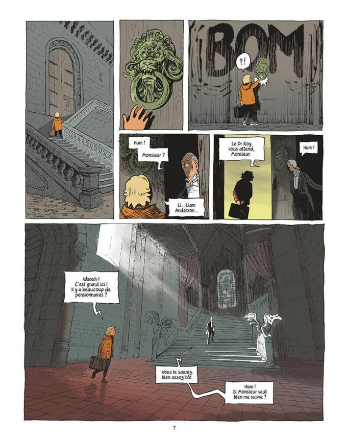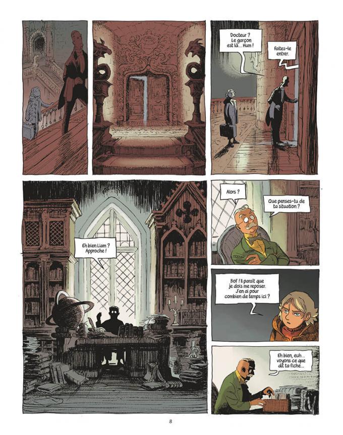 Raphaël Beuchot a maquetté le manoir en 3D afin de se repérer dans les lieux et de proposer un décor cohérent et solide. Le trait est semi-réaliste, cousin de celui d’un Cyrille Pomès. Des recoins lugubres de la bâtisse aux prairies verdoyantes de ses alentours, Beuchot nous accompagne dans les pas de Liam. L’émotion des mots de l’autrice se traduit dans ses traits crayonneux. On retiendra en particulier la très émouvante scène de la rencontre entre Liam et l’institutrice retraitée de l’école de filles. Là est la force de la bande dessinée, quand des images provoquent autant d’émotions que des mots.