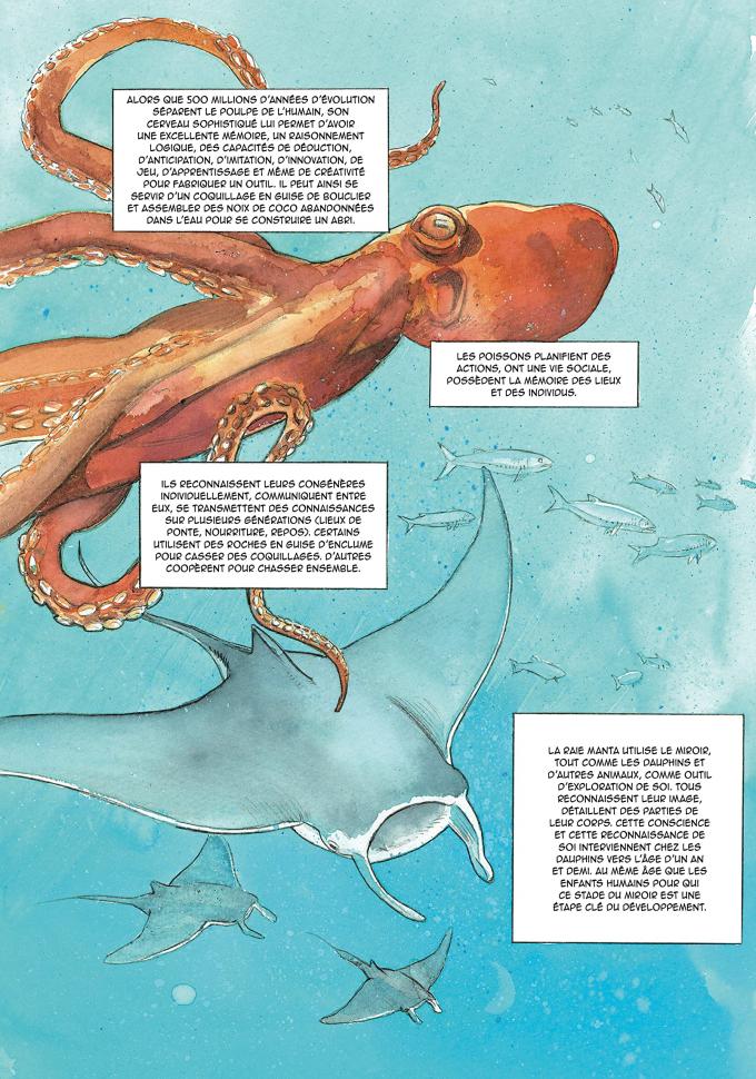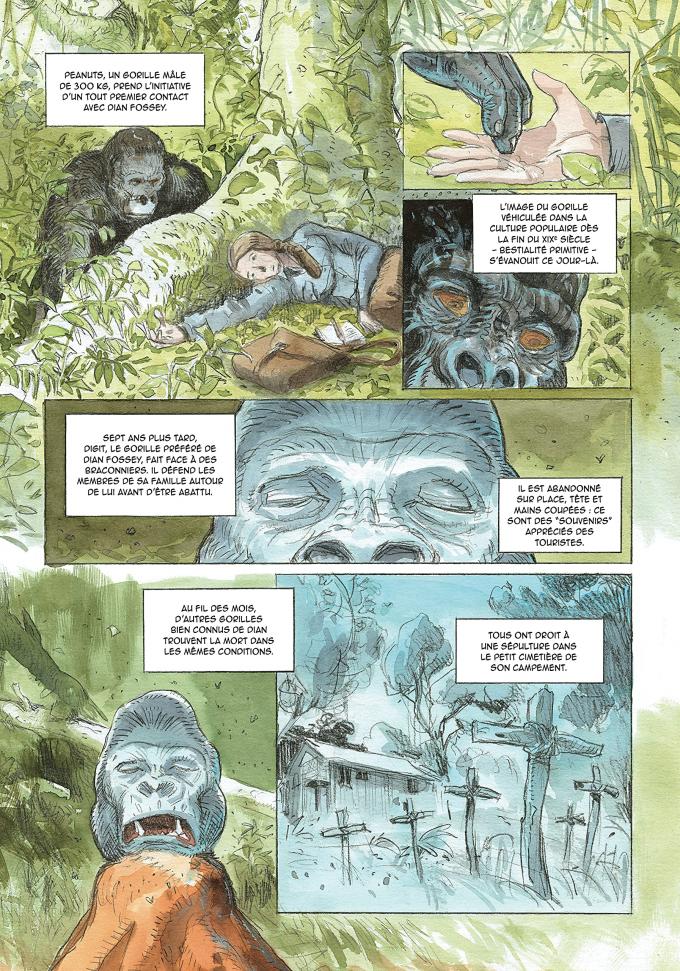 Olivier Martin représente une quantité incroyable d’espèces animales avec le même talent qu’aurait pu le faire un François Boucq. Il ajoute des doses d’humour soit par le dessin, soit par quelques réflexions des animaux. On croisera même l’étrange créature du lac noir. Dans un graphisme réaliste, il pousse la représentation de certaines scènes difficiles jusqu’à la triste vérité, pour mieux éveiller les consciences.