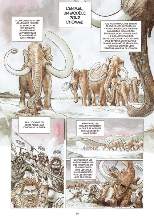 Chaîne alimentaire oblige, l’homme est la proie de nombreux animaux. Des 22 espèces de l’évolution humaine, seul l’homo sapiens, qui a maîtrisé le feu, a survécu. Migrations, chasses, domestications, l’homme fait de l’animal un pilier de la civilisation qu’il se construit. On apprend comment, les animaux devenus domestiques se sont génétiquement modifiés au fil des ans : tailles diminuées, membres raccourcis, cornes rétrécies, couleurs de robes évoluant et même caractères plus dociles. L’homme et l’animal co-évoluent. De l’Antiquité aux temps modernes en passant par le Moyen-Age, des oies du Capitole à la girafe offerte à Charles X, les animaux prennent une place considérable dans l’Histoire avec un grand H. Mythologiques en Egypte ou en Grèce, mécaniques comme le canard de Vaucanson au siècle des Lumières, ils ont fait l’objet de toutes les adorations et de toutes les expériences. Les chevaux de cavalerie, les pigeons messagers, les premiers voyageurs dans l’espace, les animaux ont accompagné l’homme ou servis d’expérimentation pour le pire. On ira jusqu’au tri des poussins et les bêtes de laboratoires. On conclura sur les conditions animales au XXIème siècle avant un épilogue manichéen donnant à l’homme les clefs de son avenir.