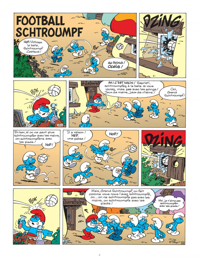 Dans Football Schtroumpf, les petits lutins bleus s’initient au ballon rond, avec toute la brutalité et l’engouement aveugle que représente ce sport. Heureusement que ce sport servira à quelque chose pour contrer l’affreux sorcier Gargamel.