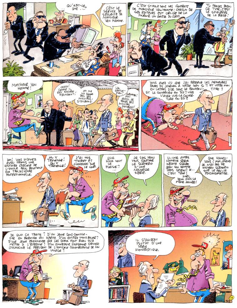 Entre test, bricolage et reportages divers sur le FC Spirou champion du monde de foot ou le « dédicace-in », les gags mettant en scène Bari, dessinateur de Lisa Desamours (350000 exemplaires à la nouveauté), Toccard, auteur Ringard, ou encore Messieurs Legain et Beneff, conseillers financiers du groupe, alternent avec ceux où l’on peut croiser des personnages réels tels Raoul Cauvin, Jean Van Hamme ou Monsieur Dupuis, le « big » boss. Autre curiosité : un même scénario du Boss himself mis en image par plusieurs dessinateurs : Maltaite, Piette, Duveau, Nix et Henriet.