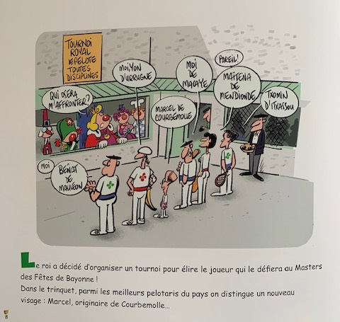 Le sommeil du bon Roi Léon, roi de Bayonne, vient d’être interrompu par une pelote reçue sur le front après avoir brisé la fenêtre de sa chambre. Il y a plus agréable pour se réveiller. Plutôt que de chasser les chenapans qui jouent à la balle sur le mur de son château, le Roi Léon décide de leur donner une leçon de pelote. Face à ces petits adversaires, le souverain paraît fortiche. Il décide donc d’organiser un tournoi pour élire le joueur qu’il affrontera au Masters des fêtes de Bayonne. Parmi les candidats, Marcel, originaire de Courbemolle, se distingue des autres.