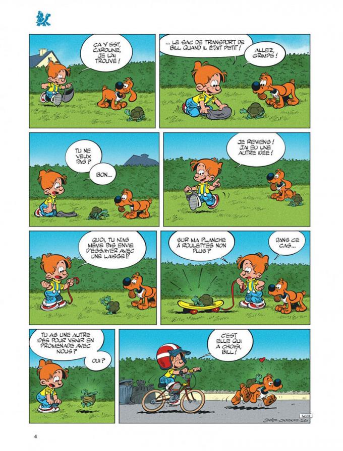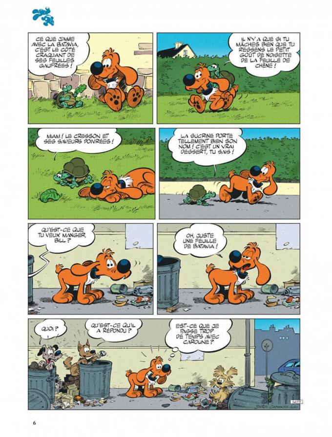 Bill se tient à Caro, Caro comme Caroline. La tortue la plus adorable de la BD est au cœur d’une partie des gags de ce quarante-et-unième album dans lequel, rassurez-vous, tout ne va pas si mal pour Bill. Entre les os planqués dans le jardin et les poubelles à vider, il ne va pas mourir de faim. Et si l’estomac du clébard guide son cerveau, il goûtera quand même la salade pour faire plaisir à la tortue. Pas terrrible…