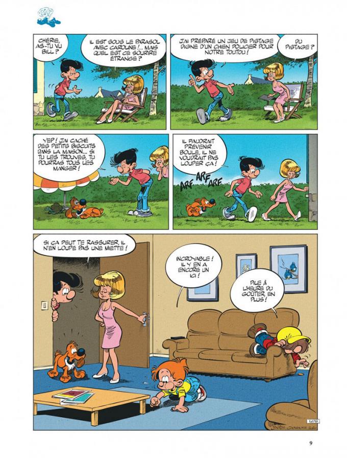 Christophe Cazenove fait encore une fois mouche. Boule et Bill appartiennent à un monde intemporel, ni ancien, ni moderne. Leurs historiettes peuvent se passer à n’importe quelle époque. La série est ainsi indémodable. Facile à dire mais pas si facile à faire. Il faut mettre de côté le moindre élément technologique qui permettrait de dater les événements, tout en faisant passer pour naturel que ces éléments n’apparaissent pas. Cazenove relève le challenge Roba avec brio. On relève quand même quelques indices permettant aux spécialistes de déceler la patte du scénariste de Cath et son chat comme dans ce gag où Boule et Bill dans leur piscine de jardin s’imaginent dans les fonds marins.