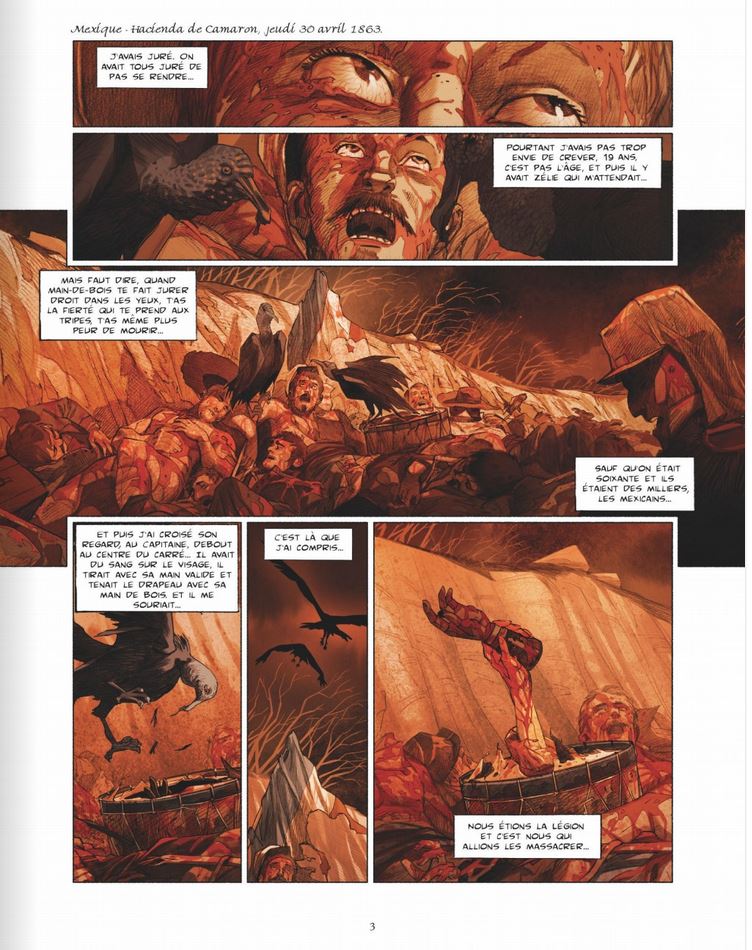 Pour sa première bande dessinée, Jean-André Yerlès, scénariste pour l’audiovisuel, s’associe au flamboyant dessin de Marc-Antoine Boidin pour nous plonger dans une épopée virtuose et romanesque aux sources de la Légion étrangère. Une institution aujourd’hui chargée de symbole et dont la légende s’est écrite dans le sang, au Mexique, lors de la bataille de Camerone de 1863. En 5 volumes, Legio Patria Nostra (« La Légion, notre patrie », devise de la Légion) nous raconte autant cette histoire que le parcours initiatique d’un orphelin des rues qui trouvera sa famille dans la Légion et apprendra parmi eux à devenir un soldat, un guerrier et tout simplement un homme dans la France turbulente du Second empire.