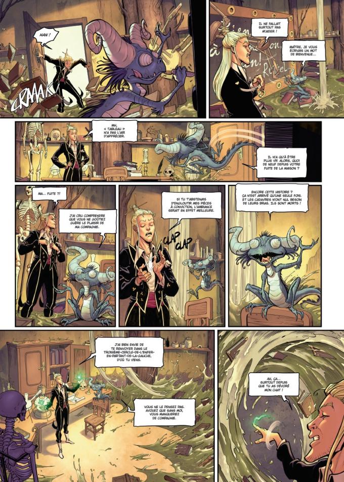 Dominici, le dessinateur de Succubes, retrouve Gihef, son scénariste de Sirènes et vikings, ainsi que de Sous la surface, qui était déjà une adaptation de roman. Le dessinateur italien pose des images sur les mots de Flamand. Le mage est accompagné d’une bestiole hors du commun, Retzel, à mi-chemin entre un Gremlins excité et le Fourreux de La quête. Les Skorjs sont des poulpes véhicules de transports bien originaux et les moufres, race chevaline, cachent des intrus.