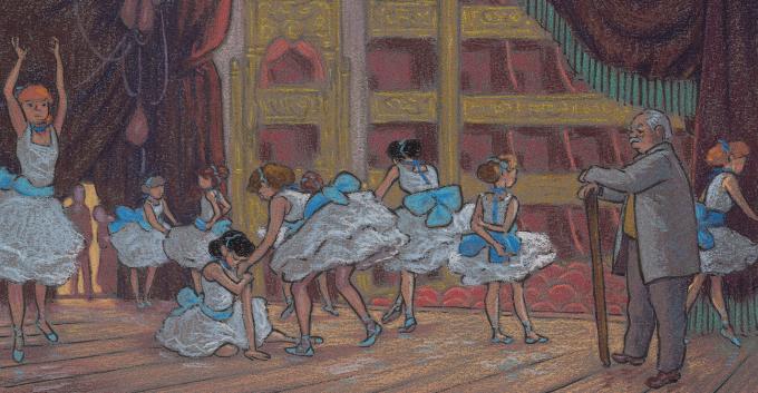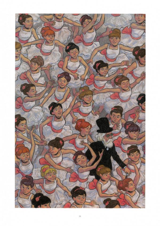 Ricard Efa transcende le scénario de Salva Rubio en fondant son graphisme dans le style de Degas, si bien que l’on ne sait pas parfois s’il s’agit de cases dessinées par l’auteur ou de fragments de toiles. Le dessinateur espagnol invite au voyage dans des décors lumineux, des coulisses de l’opéra à l’atelier du peintre, en passant par les expositions de refusés et les salons où cause le Tout Paris de l’époque. Tout en couleurs directes, chaque case est soignée dans les moindres détails. Les personnages respirent par leurs regards. Il n’y a qu’à voir la scène dans laquelle Degas se rend dans un lieu interlope masqué pour s’en rendre compte.