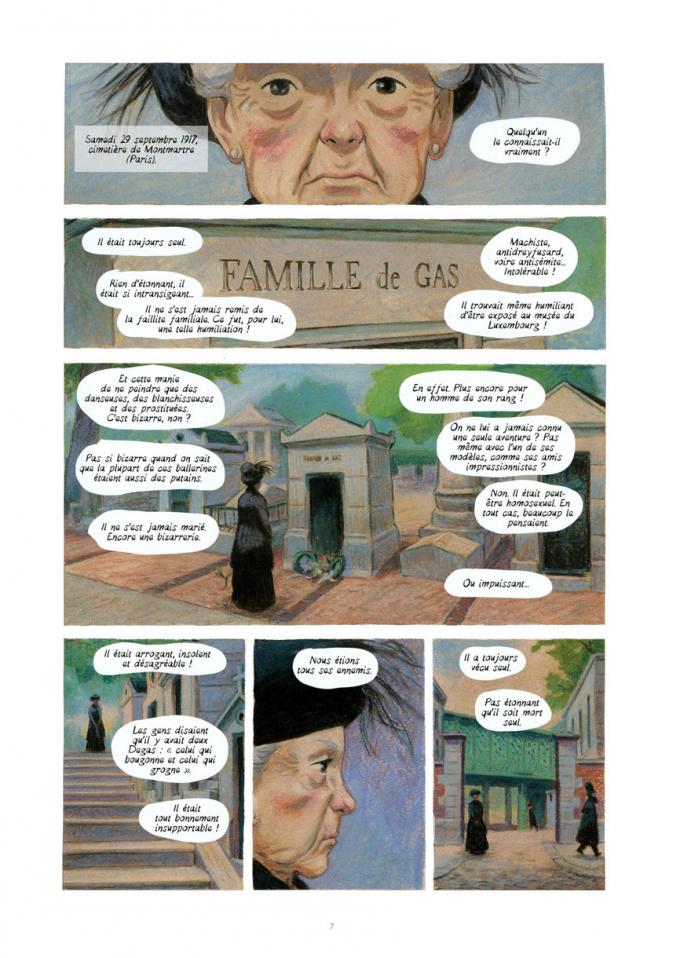 Par le truchement de la peintre Mary Cassatt, Rubio raconte la vie d’Edgar Degas. On le découvre lycéen et on suit toute sa carrière, son accession à la gloire, ses derniers jours. Le scénariste a effectué un pointilleux travail d’historien pour coller au plus près à la réalité. Sans concession, sans flagornerie, il présente l’homme qu’il était, aigri, capable d’aimer mais pas d’être amant ni aimant. En postface, Salva Rubio revient sur la façon dont il a construit sa biographie, comment il a mené son enquête.