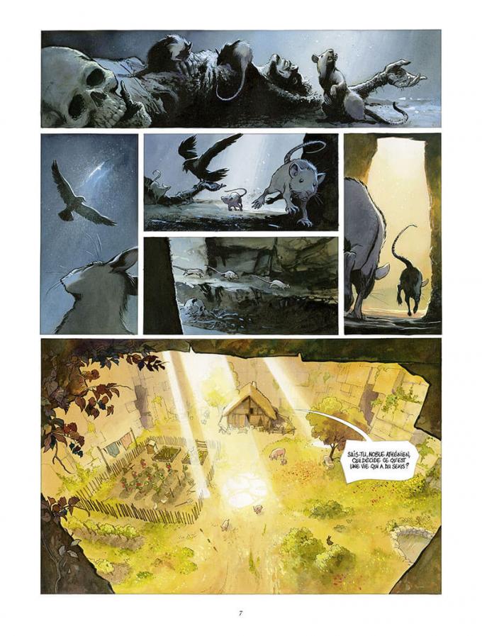 Frédéric Peynet semble trouver un style naturel. La finesse alliée à un certain clacissisme du graphisme du dessinateur du Feul et de Phoenix se complète avec une souplesse et une chaleur nouvelle en harmonie avec les tons de ces légendes universelles. On ne peut rester insensible au charme de sa Galatée. On ne peut qu’être attendri lorsque le Minotaure hume le parfum d’une fleur.
