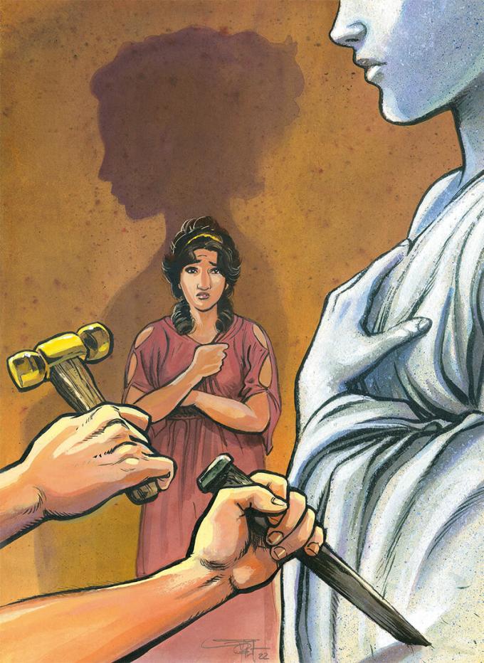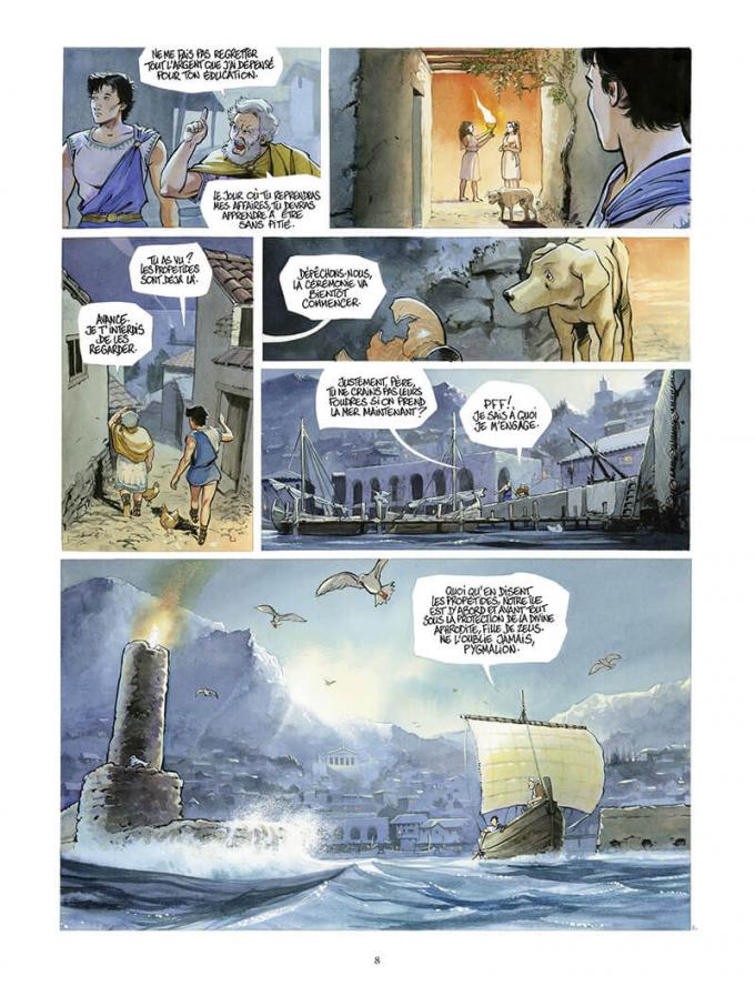 A Chypre, dans la cité d’Amathous, le bateau d’Anthéos a pris la mer sans autorisation. Pour les propétides, les prostitués sacrées gardiennes des traditions, c’est une provocation envers Poséidon. A bord du frêle esquif, Anthéos a embarqué son fils Pygmalion pour lui parler de son avenir. Il faudrait qu’il se marie, mais le jeune homme ne voit son destin que dans la passion de son métier : la sculpture. La sortie en mer vire au drame pour Anthéos lorsqu’un dragon des mers surgit de l’eau. Alors que le père a rendez-vous sur le Styx, le fils survit. La belle Agapé est amoureuse de lui. Il la prend comme modèle mais ne ressent pas de sentiments pour la belle. Il est en quête d’une sculpture de perfection. Elève du sculpteur Copias, Pygmalion dépassera-t-il son maître ? Pour peu qu’Aphrodite s’en mêle…