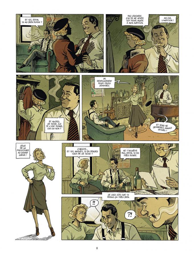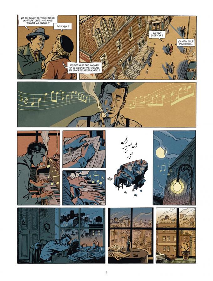 Gaël Séjourné dépeint New York, l’Europe en guerre, puis la gloire hollywoodienne des années 40. Des avions en flammes aux paillettes des tapis rouges, le dessinateur reste dans une ambiance aux ombres sépias marquant encore plus l’époque. Les « fausses » affiches des films dans lesquels joue Harvey, alias Ferenc De Nostromo, sont autant de films que l’on aurait aimé voir, hommages aux œuvres classées Freaks.