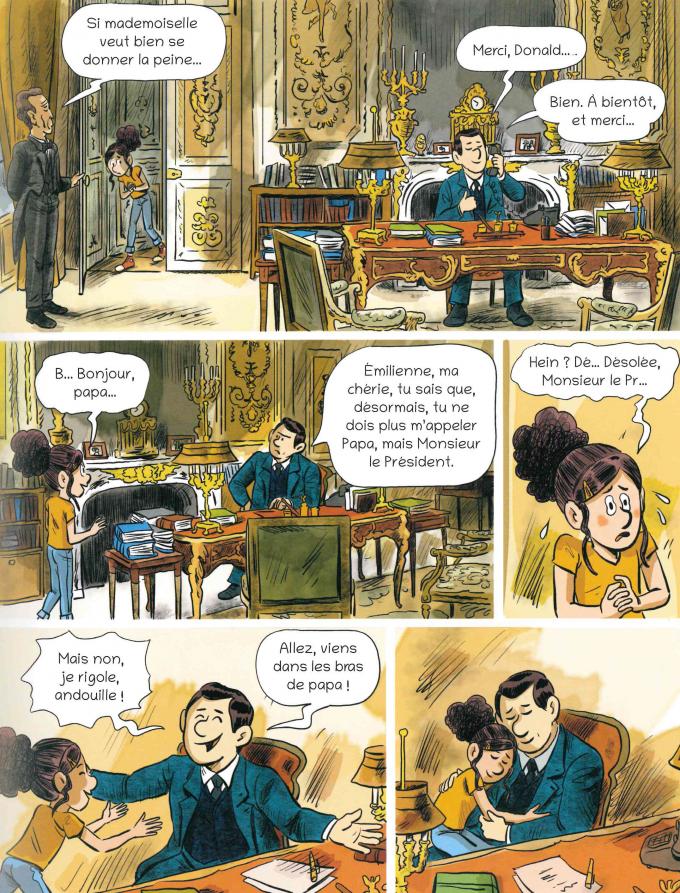 Emilienne voit sa vie bouleversée. Son père a été élu Président de la République. A présent, elle loge au Palais de l’Elysée, avec tous les avantages et inconvénients que cela comporte : une gouvernante sur le dos, un père qu’il ne faut pas déranger en plein conseil des Ministres, un adversaire politique pas très honnête, une mère attirée par les flashs des appareils photos, mais heureusement, il y a aussi Jean-Kévin, le fils du chef de la sécurité qui connaît bien les arcanes du Palais. Sauront-ils déjouer les manigances de Carnut, le chef de l’opposition, qui cherche par tous les moyens à provoquer un scandale ?