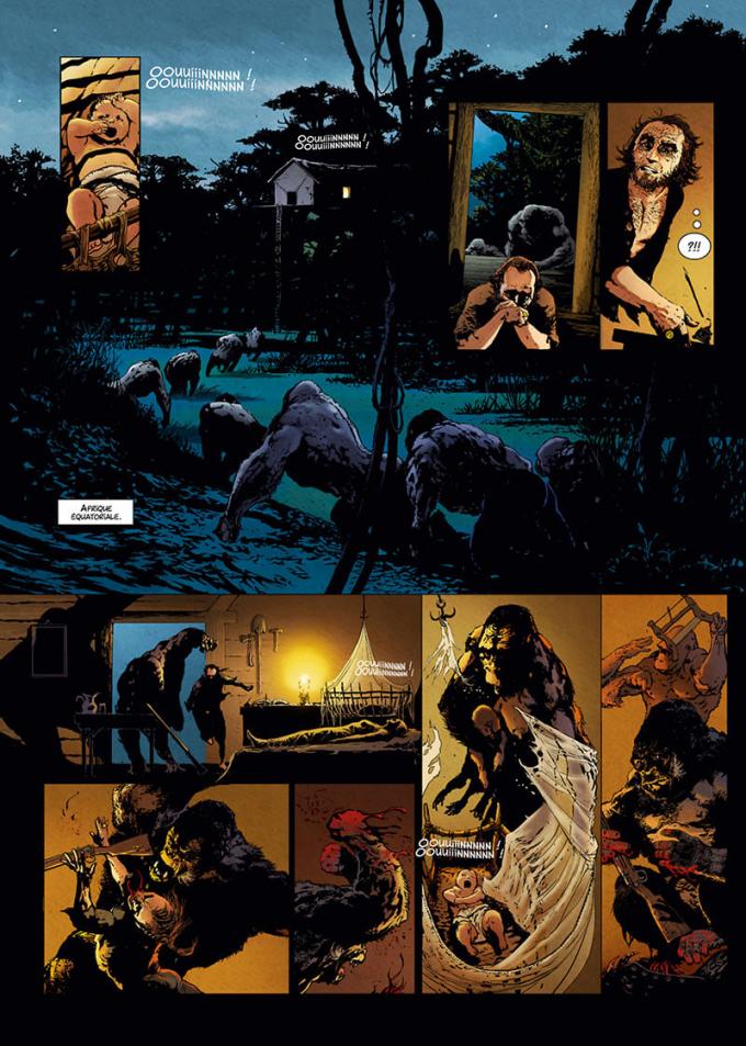 Christophe Bec ose une longue introduction sans parole, à la manière de ce qu’avaient faits les studios Pixar au cinéma avec Wall-e. Hormis quelques cartouches, il faudra attendre vingt planches avant d’entendre un phonographe chanter « Let me call you sweetheart » de Beth Slater Whiston et Leo Friedman. De la mort de ses parents à la découverte de leur cabane en passant par son enfance et son adolescence parmi les singes, la vie de Tarzan est décrite dans des planches flamboyantes. Le dessinateur serbe Stevan Subic se surpasse dans des compositions sauvages et rudes, exotiques et offrant à la nature animale et végétale un rôle prépondérant. Les premiers dialogues n’apparaissent vraiment qu’à la moitié de l’album lorsque l’on prend connaissance de l’expédition arrivant en ces terres africaines. De la rencontre avec Jane à la bataille avec la tribu, les auteurs font un grand écart réussi entre une sensibilité certaine et une action violente.