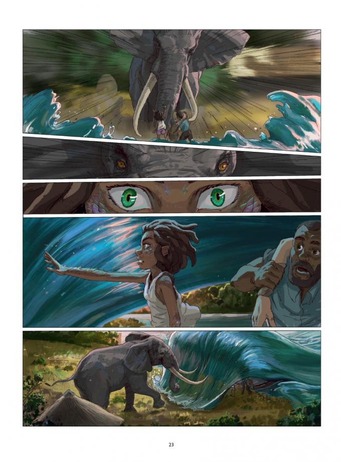 Daniel et James Clarke, accompagnés par Daniel Snaddon, ont réuni tous les composants nécessaires pour réaliser une grande aventure comme on en fait rarement. Kariba a tout du grand spectacle comme on en voit encore parfois au cinéma, comme on en lit encore de temps en temps, et qui réunit les générations. Là où le jeune lecteur verra la quête d’une gamine aux pouvoirs magiques qui recherche son père dans un décor majestueux, les adultes décèleront les conséquences ravageuses de la construction d’un barrage hydraulique. Par la métaphore de Nyaminyami, poisson-serpent géant attaquent le chant, les auteurs dénoncent la colonisation d’un peuple qui ne demandait rien à personne. Dans la préface, les auteurs revendiquent leur volonté de présenter une œuvre de fiction, accompagnant l’Histoire comme on peut accompagner un rêve au réveil, en finissant par faire sens.