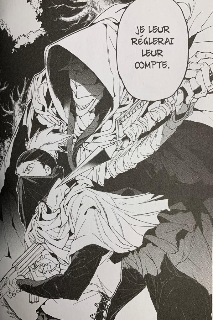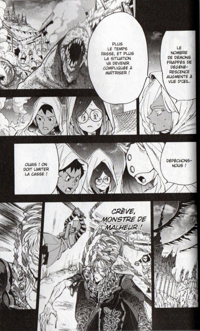 Mis à mort par la maison royale, les démons Sonju et Mujika ont survécu dans le plus grand secret. Ils sont les seuls de leur race pouvant survivre sans devoir manger d’humains. En pleine forêt, ils sont retrouvés par Don et Gilda. Alors que le plan de Norman est d’exterminer toute la famille royale pendant la cérémonie de Tifari, Emma et se amis s’opposent à cette décision radicale. Nous sommes le 7 novembre 2047. Norman est déjà en route pour la capitale. Sera-t-il arrêté à temps avant le génocide ? Si les nobles se font tuer, c’est tout le système politique des démons qui va s’écrouler et avec lui les possibilités de négociation.