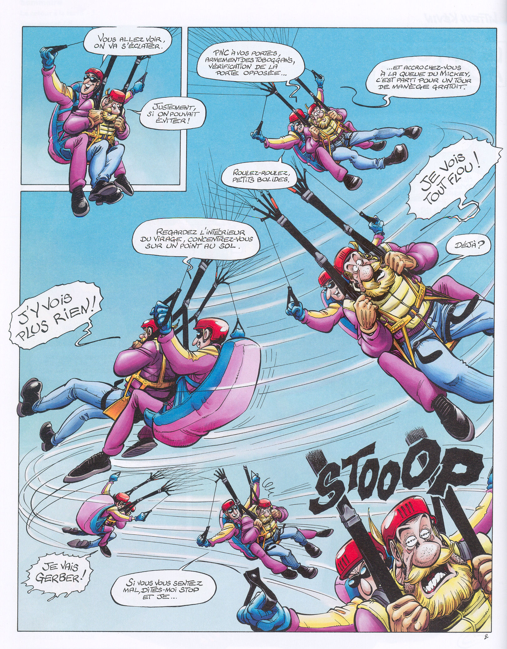 Oui, la moto, ça m’a pris très tôt ! Mes parents ont assisté à une compétition de moto-cross quelque jours avant que ma mère n’accouche. D’où, peut-être ?! Quand j’étais gamin, il n’y avait pas de magazine « Harley-Davidson », juste deux ou trois photos. Quand j’ai eu 12 ans, il y a eu le film Easy Rider ! Les cheveux dans le vent, la liberté… Je ne me reconnaissais pas dans le mouvement hippie que j’aimais pourtant bien, mais là, c’était des hippies à moto : encore mieux ! À 13 ans, j’ai acheté une 50 cc. La première chose que j’ai faite a été d’y installer un dossier à l’arrière et un guidon « corne de vache » ! Et puis, je ne sais pas pourquoi, j’aime le look motard. La moto prolonge, en quelque sorte, le tableau qu’offre le mec. C’est pas de la frime, c’est de la générosité ! C’est offrir une carte postale aux gens ! Vous n’avez pas l’impression d’entretenir un cliché ? Tout le monde ne vit pas comme ça, c’est certain. Quand j’ai commencé, je ne me suis même pas posé la question. Il y a beaucoup d’anecdotes réelles dans Litteul Kévin. C’est mon quotidien… Jusque dans le look rock’n’roll ! Je voulais aussi dire que ça n’est pas incompatible avec une vie de famille et des valeurs saines. On peut être rebelle à l’échelle d’une famille, comme on peut vivre un quotidien normal en tant que punk ! Cela dit, il n’y a pas de message dans Litteul Kévin, juste mes valeurs. Si vous voulez un message, lisez Les Voisins du 109 ! En revanche, j’essaie de rester actuel, de me renseigner pour être dans l’air du temps. Certains dessinent toujours les gendarmes avec un képi parce qu’ils ont appris à dessiner les gendarmes avec le Longtarin de Franquin. Mais, ça fait vingt ans qu’ils n’en portent plus ! Personnellement, je n’écoute pas exclusivement la musique de ma jeunesse ; j’essaie de voir un maximum de nouveaux films, etc. Ce nouvel album fourmille effectivement de références récentes, comme Naruto ou South Park… Parfois, la modernité, c’est simplement une coupe de cheveux ou un PT Cruiser au premier plan. Mais, je place des clins d’œil qui parleront à ceux qui regardent les mêmes choses que moi. South Park, par exemple, fait partie des choses qui me nourrissent quotidiennement. Ils mettent souvent des mots sur des idées que je partage, tel mon refus d’aller voter tant que mon vote blanc ne sera pas pris en compte ! Vous parlez des idées. On a souvent mis en avant votre travail graphique, mais ce serait oublier un peu vite votre vie de scénariste. Vous semblez, par exemple, affectionner les jeux de mots et autres phrases musicales… Les idées me viennent assez facilement. Je les note dans des carnets qui fournissent la matière première de gags que je retravaille jusque dans les planches. Il m’arrive souvent de modifier le texte à l’étape du dessin, parce que je fais en effet très attention à la musique du texte, voire à l’équilibre des lignes dans une bulle. Par moments, vous avez un sens dialogue assez proche de celui d’un Goscinny… C’est le moment de rendre à César ce qui lui appartient ! Je me suis toujours réclamé de Gotlib. Mais avant lui, j’ai appris à lire, seul, vers l’âge de 4 ans, en feuilletant des Astérix. Un jour, un collègue m’a fait remarquer qu’avec ses cheveux blonds et ses gros sourcils noirs, mon Litteul Kévin, c’était Astérix ! Le nez de Chacal et ses pommettes sont « obelixiennes ». Et puis, mes bikers, avec leurs barbes et leurs cheveux longs, c’est un village gaulois ! Ce nouvel album est également l’album du passage à la couleur, une révolution pour la série ! En fait, c’est prévu depuis 1995 ! Je me souviens, au cocktail des 20 ans de « Fluide Glacial », je leur ai dit que la prochaine révolution du magazine serait, en l’An 2000, le passage à la couleur. Et j’avais raison ! J’en avais envie, ne serait-ce que parce que les jeunes d’aujourd’hui ont été bercés à la couleur. Je cite toujours l’exemple du cinéaste Henri Verneuil qui était ravi de la colorisation, pourtant grossière, de son film La Vache et le Prisonnier, parce qu’il aurait voulu le réaliser comme ça à l’époque. C’est pareil pour moi. Litteul Kévin a démarré en noir et blanc parce que c’était la règle à « Fluide Glacial ». Les derniers albums ont toutefois été faits en pensant à la couleur. Lorsque je me suis lancé sur Les Voisins du 109, j’ai fait des couleurs directes parce que je voulais me prouver quelque chose. Soyons néanmoins honnêtes, c’est très mal payé ! Et, si mon trait est inimitable, il est possible d’arriver à quelque chose d’approchant de mon travail en couleurs. J’ai donc travaillé avec un coloriste sur Litteul Kévin. Mais, comme il y a des aficionados du noir et blanc, on a pensé à eux : on sort aussi l’album sous cette forme. Par contre, certaines histoires leur paraîtront bien « blanches », parce qu’elles ont été dessinées pour être mises en couleurs.