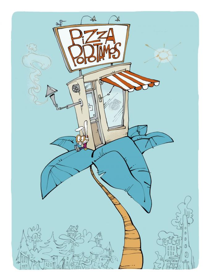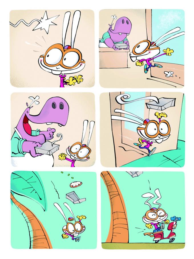 Le patron du resto, c’est un gros hippopotame rigolo, à la toque fine et longue. L’enseigne Pizza Popotamos trône au-dessus du frêle baraquement au sommet d’un palmier. Le livreur est un petit lapin blanc à lunettes. Tel celui d’Alice au pays des merveilles, il court, il court, il court, ou plutôt, il roule, il roule, il roule sur son scooter rouge. Il file comme le vent, croise une petite lapine qui lui donne des petits cœurs dans les yeux. On verra une famille canard sur un passage piéton, un éléphant qui fait la sieste, de joyeux oiseaux chanteurs, un crocodile cabossé, une tortue clin d’œil à la fable et bien d’autres animaux. Une forêt inquiétante et mystérieusesaux arbres aux branches crochues fait penser à celle qui effraye Blanche-Neige. Tout ça a failli finir par un drame mais c’est impossible dans un enchantement comme celui-ci.