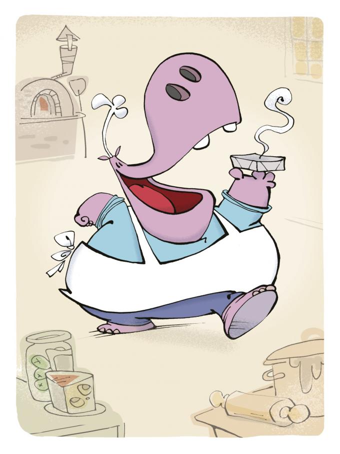Le chef cuistot fait virevolter la pâte. Il la nappe d’une couche de sauce tomate et ajoute quelques ingrédients. Il enfourne dans le four à bois, la sort quelques minutes plus tard et la met dans une boîte en carton grande et plate. Avant de la refermer, il ajoute trois olive. Enfin, il appelle le petit lapin pour qu’il la porte au client. C’est parti pour la livraison de la pizza !