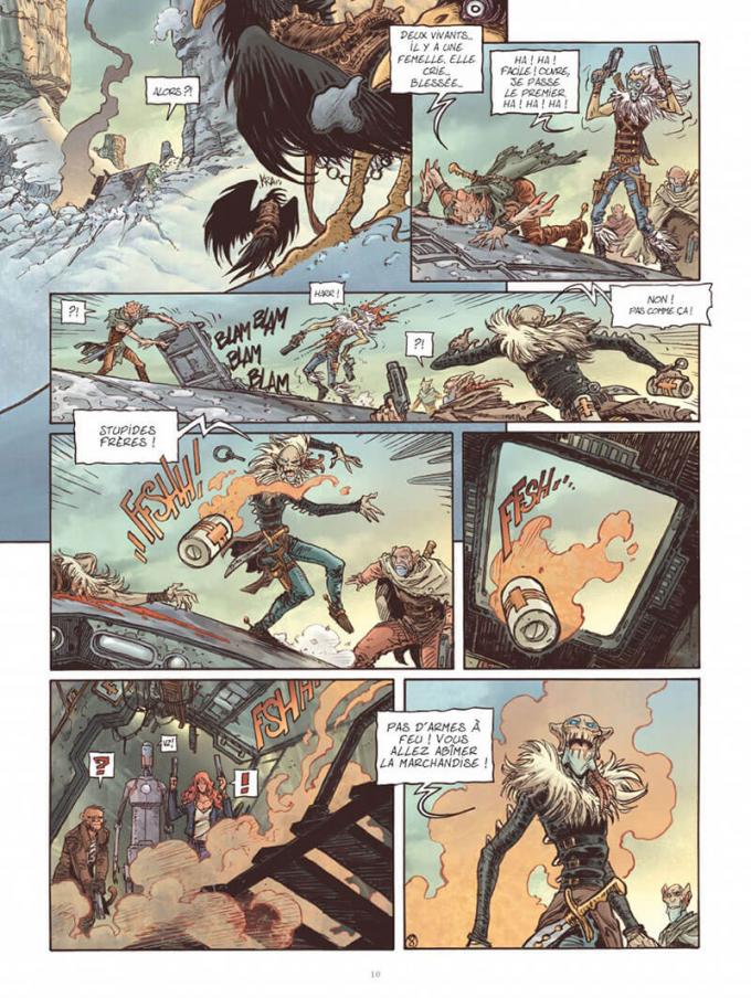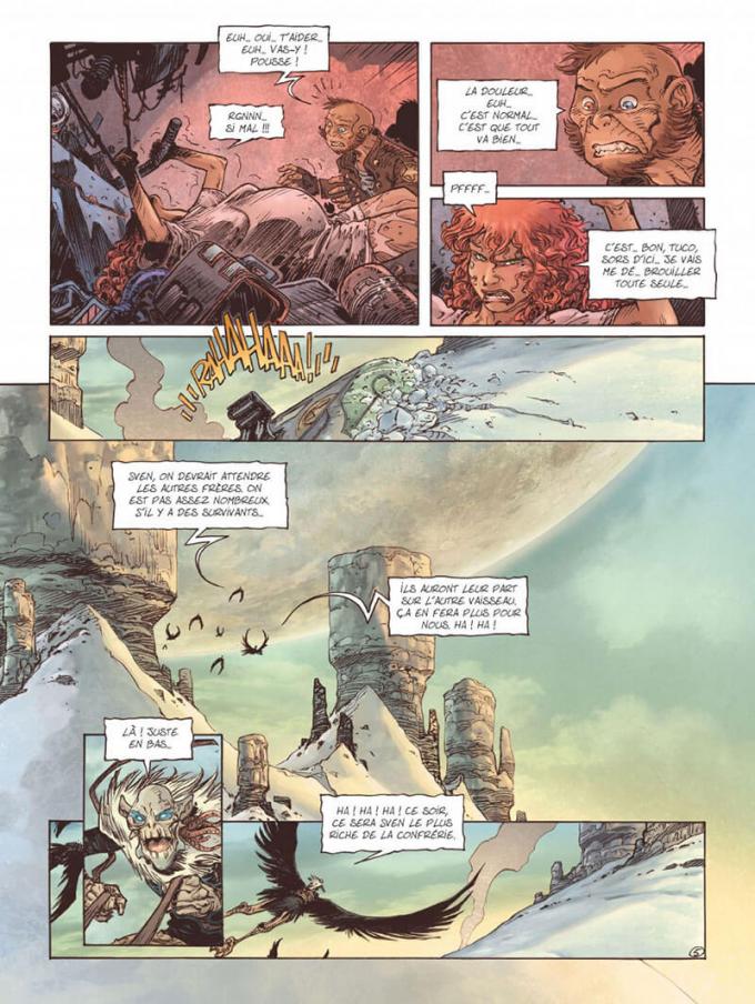 Tout est allé si vite. L’UCC Dolores s’est posé en catastrophe. L’appareil est dans un sale état. Tuco tente tant bien que mal de contacter des secours par radio, mais elle est grillée. Pendant ce temps, Mony est en train d’accoucher. Une fille ! C’est une fille ! Une naissance dans un vaisseau de guerre, ça porte la poisse. Tuco la met à l’abri dans le corps d’un robot-couveuse où elle sera en sécurité. En sécurité, en sécurité,… Oui… Enfin, jusqu’à ce que Sven et ses pilleurs les attaquent et repartent avec le robot, et donc le bébé, comme butin. Mony n’a pas dit son dernier mot. Elle n’a pas l’intention de laisser son bébé dans des mains ennemies.