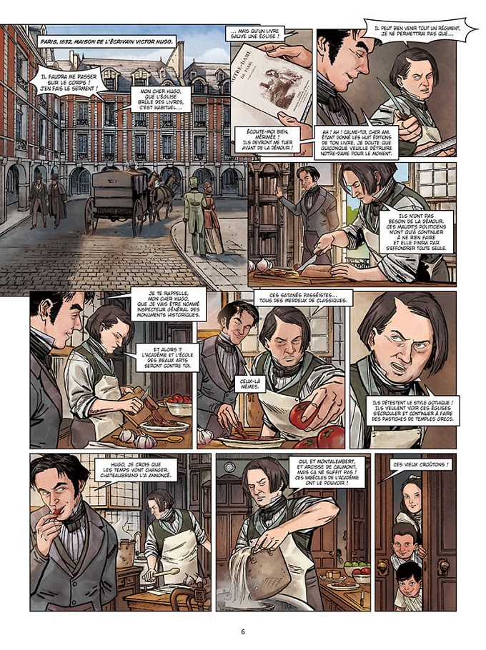 C’est cette incroyable histoire qui va nous être exposée par le scénariste Salvia Rubio et le dessinateur Eduardo Ocana. Ce duo va plus particulièrement s’attacher à nous expliquer la vie d’Eugène Viollet-Le-Duc, un architecte allant à contre-courant de son époque afin de sauver l’art gothique alors qu’il ne possédait aucun diplôme des Beaux-Arts. A la mort de Jean-Baptiste Antoine Lassus, Viollet-le-Duc va se retrouver seul pour terminer l’immense travail de restauration de Notre-Dame de Paris.