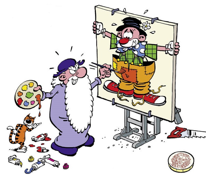 Turk est de loin l’un des meilleurs dessinateurs humoristiques du monde. Son trait épais, rond, reconnaissable entre mille, est d’une efficacité redoutable. Même ses onomatopées sont vivantes. Leurs lettres souffrent ou claquent au rythme du disciple ou des inventions.