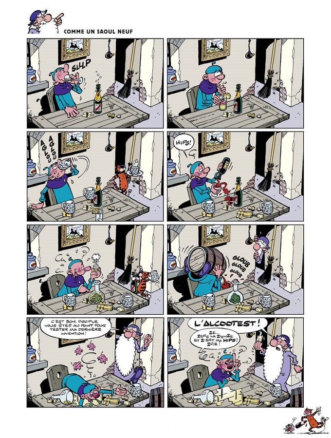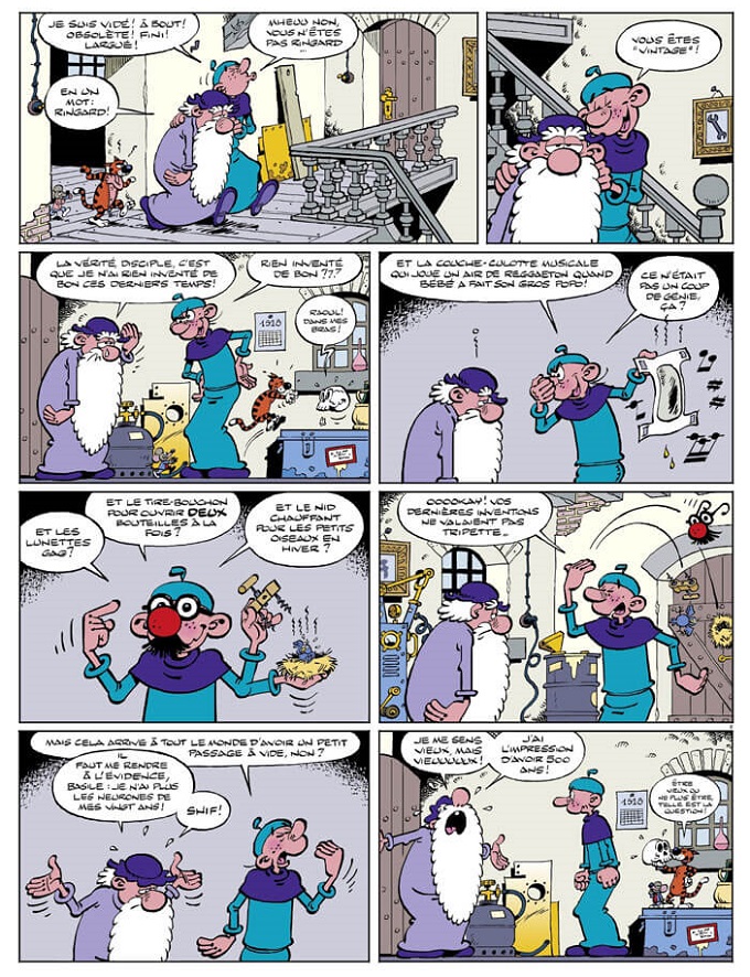 On ne sait pas si les auteurs ont lu notre dernière chronique léonardienne sur BD-Best, mais les fins d’histoires, symbolisées par des saynètes en dessin unique de Raoul et Bernadette, ne débordent plus la dernière case de la planche. La lecture de la planche n’est plus « perturbée » par ce gag supplémentaire, qui de fait, prend une dimension beaucoup plus truculente.