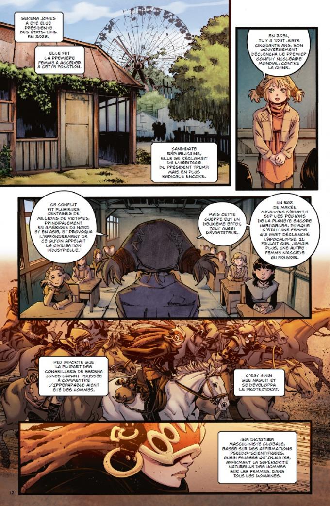 Sylvain Runberg et Anna Saveg écrivent une uchronie à quatre mains. Il fallait cette double vision masculine et féminine pour traiter d’un tel sujet mettant la différence des sexes au cœur du problème. Les auteurs démontrent comment l’héritage politique radical républicain a amené à l’effondrement de la civilisation industrielle et à un raz de marée misogyne car tout cela été dû à une certaine Serena Jones, présidente des Etats-Unis élue quelques années plus tôt en 2028 et héritière spirituelle de Trump… en pire. Et comme dans la politique contemporaine que nous connaissons, il y a des scissions aux seins même des clans.