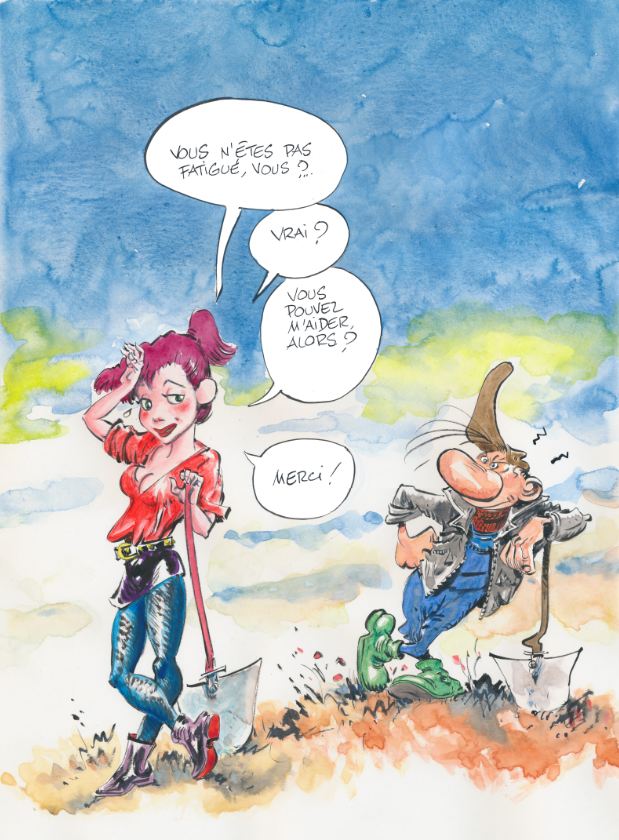 Mais, moi qui aimais bien les femmes, je voulais en dessiner une nouvelle pour Pierre Tombal. Du coup, le temps de deux albums, il y a eu toute une série de gags dans lesquels Pierre essayait de trouver chaussure à son pied. Moi, je voulais que ça se conclue, Cauvin pas. Du coup, il a pondu la cousine qui vient réclamer sa part du marché.