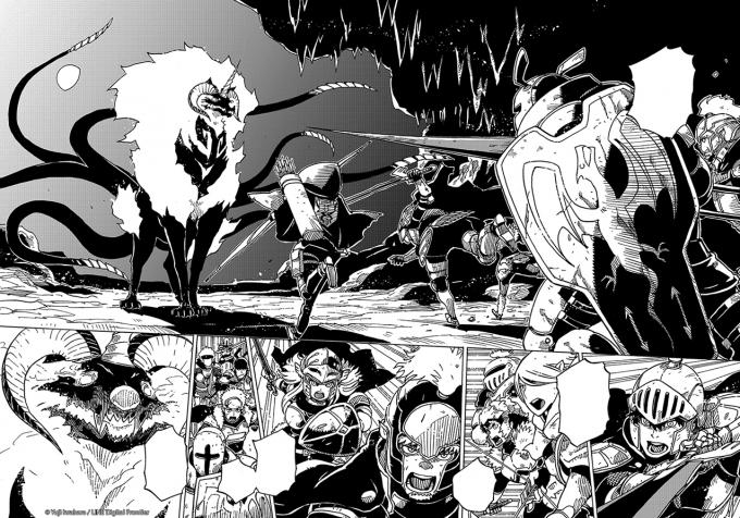 - C’est vrai… Nous n’avons jamais eu affaire à une bête aussi terrible… Mais qu’importe ! Nous sommes les 13 héros adoubés par le roi de Hiden ! Je le jure sur mon honneur et sur cet acier écarlate suprême ! Cette créature ne repartira pas d’ici vivante !! »
