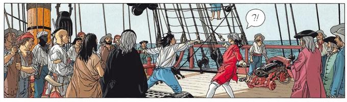 Pellerin aura mis cinq ans pour boucler les quarante-six planches de cet épisode. C’est long, très long, trop long pour un récit à suivre. Les lecteurs devront se replonger dans les tomes précédents pour se remettre dans l’ambiance. Ça, ce n’est pas trop un problème. Par contre, on imagine mal de nouveaux lecteurs, jeunes ou moins jeunes, prendre le train en marche, ou plutôt le navire en vogue. Ils seraient pourtant récompensés par une histoire d’aventure et de politique historique au trait minutieux et aux détails soignés. Les lattes des parquets sont toutes dessinées. Il ne manque pas un bouton sur un uniforme si un hauban sur un navire. Un travail de titan frisant la perfection.