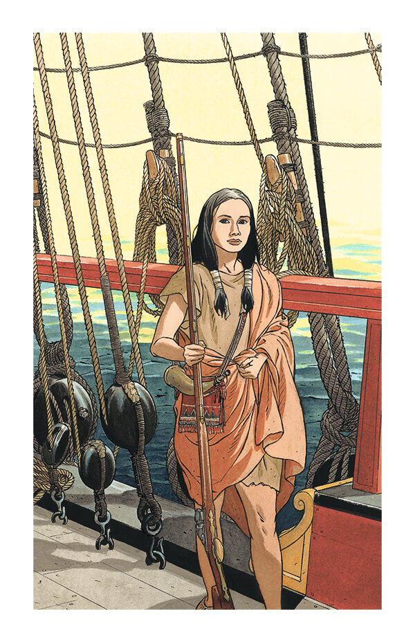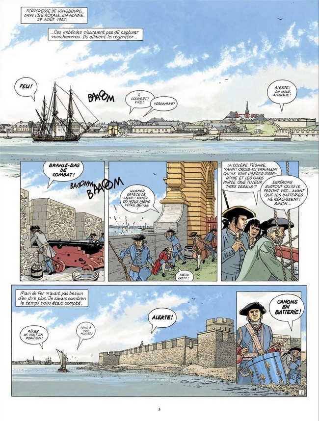 Entre le renouveau de Barbe-Rouge, sous la houlette de Jean-Charles Krahen et Stefano Carloni, et Tomahawk par Patrick Prugne, ce nouveau chapitre du second cycle de L’Epervier occupe une place pivot particulière. Patrice Pellerin a, au siècle dernier, dessiné deux aventures du pirate de Charlier sur des scenarii de son créateur. Il fait à présent traverser l’Atlantique à son héros pour le Nouveau monde où il aurait pu rencontrer les personnages de Prugne. L’auteur de L’Epervier mêle habilement personnages fictifs et réels, parmi lesquels le comte de Maurepas, secrétaire d’Etat à la Marine et Ministre de l’Intérieur, et Onontio Goa, la plus grande montagne de la Terre, plus connu des non-indiens sous le nom de Louis XV.