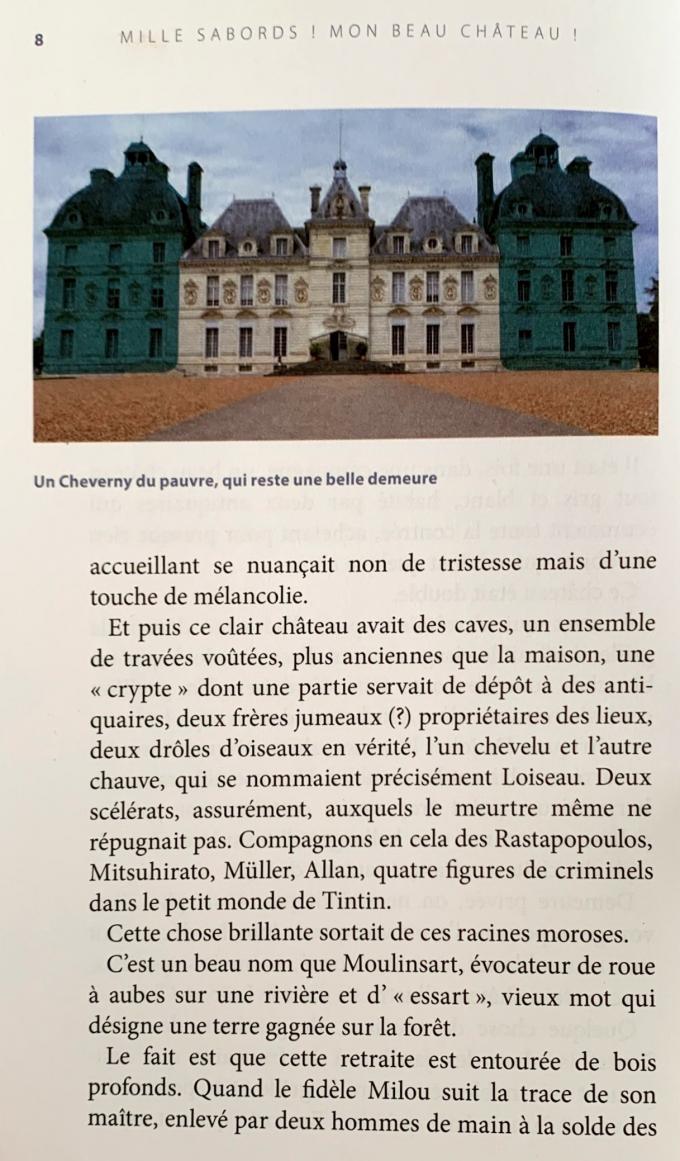 « Il était une fois, dans une campagne, un beau château tout gris et blanc, habité par deux antiquaires qui écumaient toute la contrée, achetant pour presque rien des objets qui valaient quelque chose. (…) C’est un beau nom que Moulinsart, évocateur de roue à aubes sur une rivière et d’« essart », vieux mot qui désigne une terre gagnée sur la forêt »