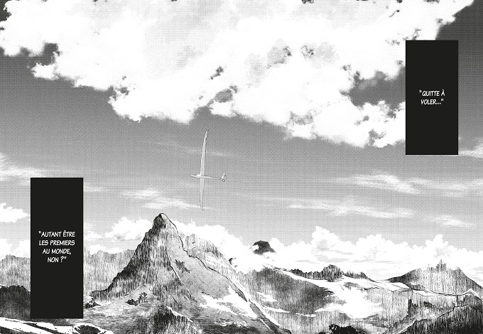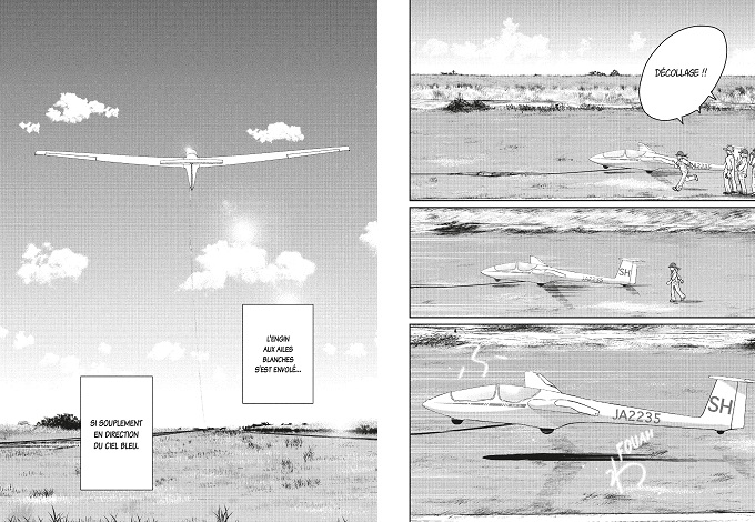 Blue Thermal est classé dans la catégorie Shojo. Or, hormis une bluette secondaire justifiant cette catégorisation, l’argument de la série est ailleurs, plus universel. Alors qu’on ne s’y attend pas, on se trouve embarqué malgré soi dans le bleu du ciel. On voudrait ne jamais atterrir et profiter. On entendrait presque le son du gonflement des nuages. On est dans un livre, mais il y a du vent. C’est en noir et blanc, mais il y a du bleu.