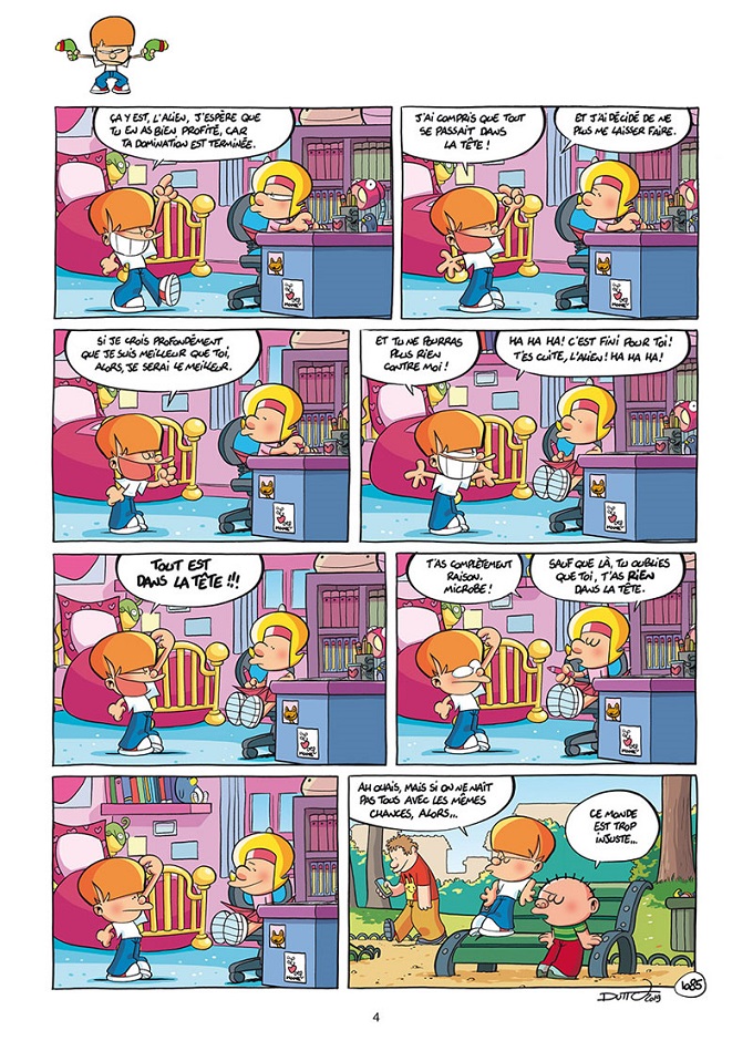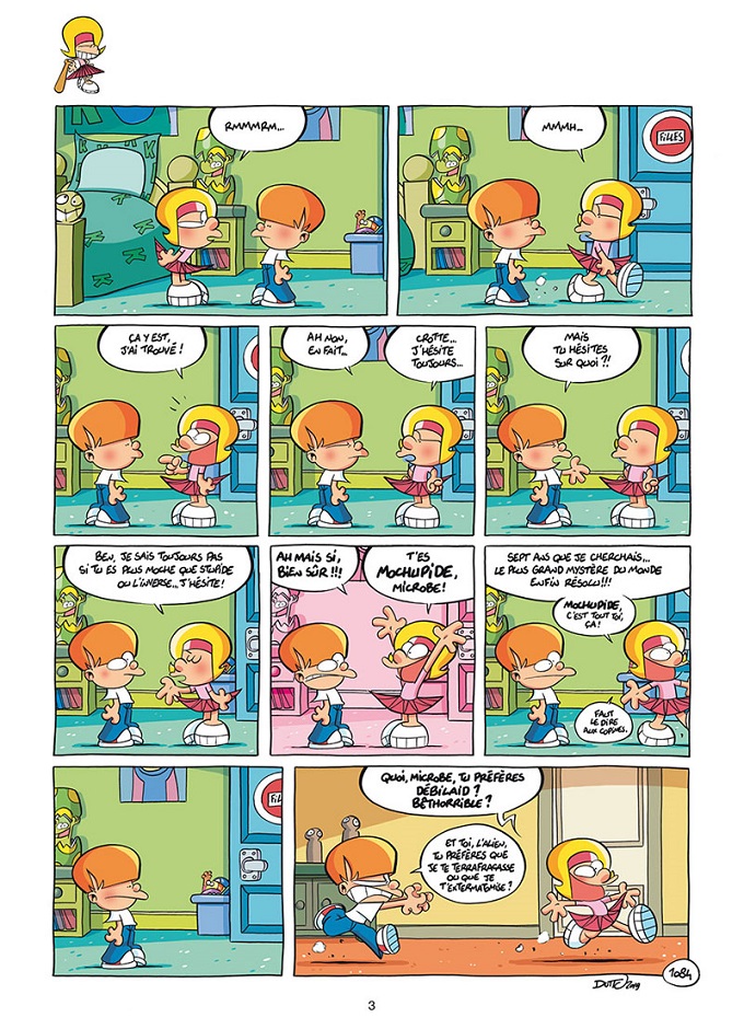 Dutto, c’est l’humour familial, tout public et universel. Comment, après plus de 1000 gags continuer à faire rire avec deux frère-sœur qui se détestent amoureusement ou qui s’aiment haineusement ? Demandez à Dutto. On ne s’en lasse pas. Il y a toujours des petites nouveautés ou des thèmes que prennent certains gags de tel ou tel album : Ici, un drône, un royaume des débiles et, palme d’or, un escargot, hermaphrodite par définition, qui s’auto-agresse.