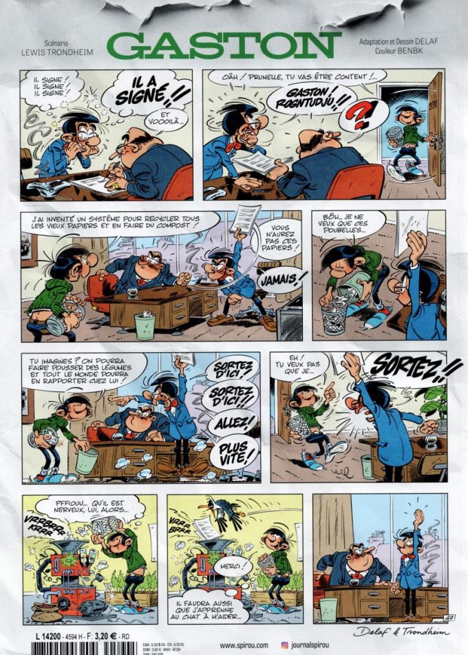 C’est le grand retour de Gaston Lagaffe. Delaf est toujours aux crayons, épaulé cette fois-ci au scénario par le grand Lewis Trondheim. Ça promet. Si l’album est prévu pour la fin de l’année, c’est cette semaine qu’il revient dans Spirou. Pour l’événement, le magazine existe avec quatre couvertures différentes et quatre gags d’introduction différent des Fabrice. Que vous soyiez Gaston, chat, mouette ou espadrille, vous en trouverez forcément un à votre goût. Inutile de préciser que, comme à la grande époque, le gaffeur a mis la panique à l’intérieur du journal.
