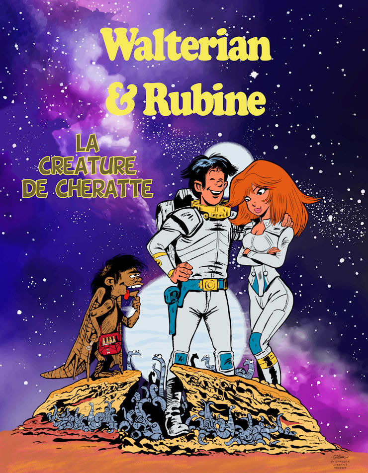 C’était l’idée de Pierre Seron. On revenait d'Angoulême un jour et il y avait sept à huit heures de train. Tout en parlant, on s’est dit qu’on avait un style de dessin très proche. On pourrait se faire rencontrer nos personnages, même dans l’espace si c’est nécessaire. J’ai pensé que c’était une bonne idée. En discutant le long du trajet, on en est arrivé à la conclusion que ce serait encore plus rigolo, de faire deux histoires qui s'interfèrent l’une dans l’autre. Comme j’avais déjà sept pages de dessinées dans ma nouvelle histoire, il m’a dit: ”Ce n’est rien. Tu m’envoies des copies et moi j’adapterai mon histoire à la tienne”. Au fur et à mesure que j’avançais je lui envoyé mes planches et lui créait son scénario d'après ça, bien que ce soit très différent de ce que je faisais. Dans certains passages, je lui disais : “Attention nos personnages vont travailler pendant deux ou trois planches ensemble.”. Au fur et à mesure, il dessinait ses petits personnages, me les envoyait et Walt les redessinait sur nos planches. C'était très complexe car à l’époque il n’y avait pas de mail et toute l'électronique. Alors on faisait des photocopies que l’on envoyait par la poste. Ça nous a coûté une petite fortune en timbres mais ça a fonctionné. Pierre Seron était un virtuose. Il savait s’adapter à tout.