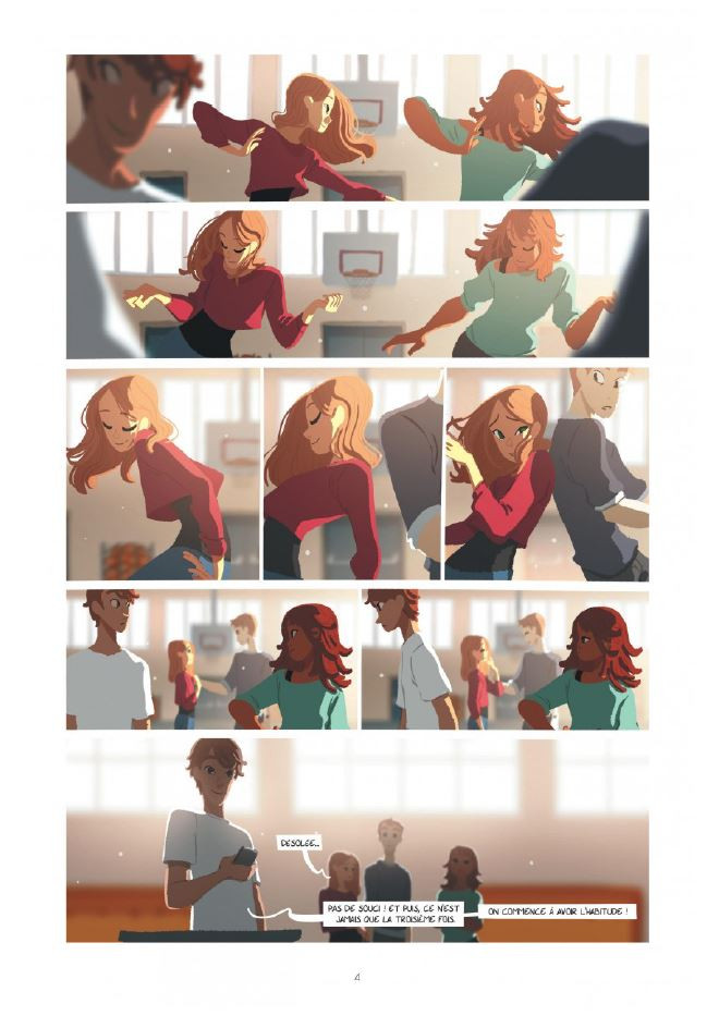 Moi, j’ai été bluffé sur cette succession de planches où vous capter inévitablement notre regard pour permettre une lecture à contre-courant de ce qui se fait d’habitude. Sur la page de gauche, on lit de gauche à droite, en descendant, puis on arrive sur la page de droite par le bas et on remonte en slalom. On remonte un escalier, suivant l’odeur de frites que le papa de Yasmina véhicule en remontant chez lui. Je ne m’en suis pas remis.