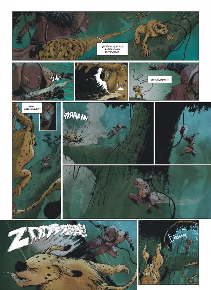 Il n’y a pas de dialogue dans les premières planches de cet album. J’y tenais. J’ai travaillé très fort sur le rythme, je ne voulais pas que ça paraisse trop lourd. Commencer sans le texte, en laissant l’image raconter, c’est laisser la possibilité au lecteur d’être absorbé. J’ai chassé les gros blocs de texte. Ça m’a forcé à trouver des solutions très originales.