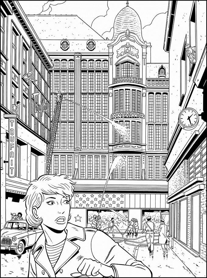 Je travaille de façon très scolaire. Le fait d’avoir amené mes filles à l’école parce que ma femme travaillait et moi j’étais à la maison, c’est resté en fait. Le mercredi après-midi, je fais de la paperasse mais je ne travaille pas. Je travaille de 8h à 12h. Je fais une pause jusqu’à 14h et je reprends jusqu’à 19h. En principe, j’attaque la planche en noir et blanc en début de semaine et je mets la couleur en fin de semaine. Sur Les Sisters par exemple, j’essaie de faire deux planches couleurs comprises dans la semaine. Sur Tizombie et Wat, je fais trois planches mais seulement en noir et blanc. Je travaille en écoutant la radio ou de la musique. Je regarde parfois des vidéos, des documentaires, … Et parfois, il n’y a rien. J’ouvre la fenêtre et j’écoute les oiseaux qui chantent.