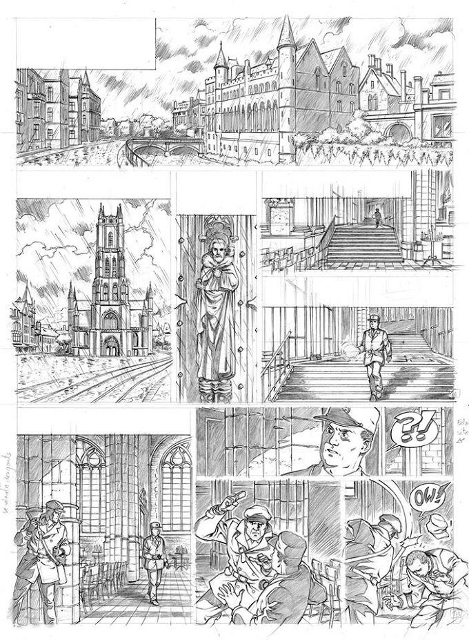 Sur mon blog, je faisais plutôt des dessins genre dessins de presse. J’ai demandé à Christophe de me faire une mise en page écrite pour voir si j’arrivais à retranscrire ça et le transformer en page de BD. Comme le résultat nous plaisait, on l’a proposé à Olivier Sulpice, éditeur chez Bamboo. Il m’a appelé tout de suite pour me dire qu’il était intéressé. Je lui parle de Christophe au téléphone, en lui disant qu’il aimerait bien m’aider pour scénariser, qu’on travaillerait donc à deux sur les scénars.