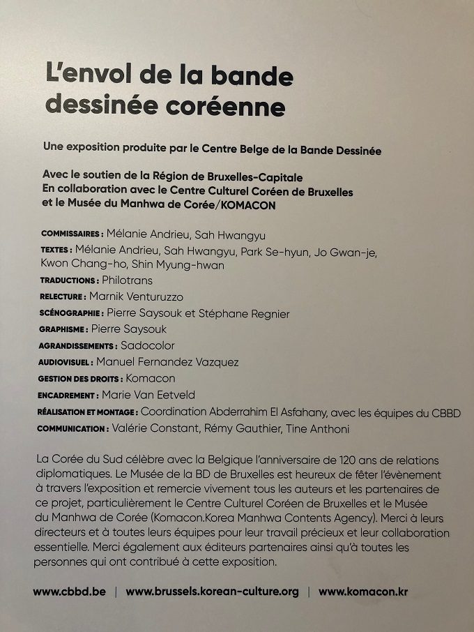 Cette année, la Belgique célèbre les 120 ans de ses relations diplomatiques avec la Corée du Sud. Le 23 mars 1901, la Belgique et la Corée ont signé un traité d'amitié, de commerce et de navigation. A cette occasion, Le Centre Belge de la Bande Dessinée de Bruxelles invite ses visiteurs à un voyage en Corée, à la découverte de son histoire et de sa culture. En retraçant 100 ans d’histoire du manhwa, le parcours propose un véritable voyage dans le temps à travers des étapes décisives : les premiers dessins parus dans la presse dès 1909, l’immersion dans un manhwabang des années 1960, la découverte d’auteurs majeurs, ou encore l’expérience de scrolling avec les webtoons et actualités les plus connectées ! Sur papier, sur Internet ou sur smartphone, la bande dessinée coréenne ne cesse d’évoluer pour divertir les lecteurs et les captiver, encore et toujours !
