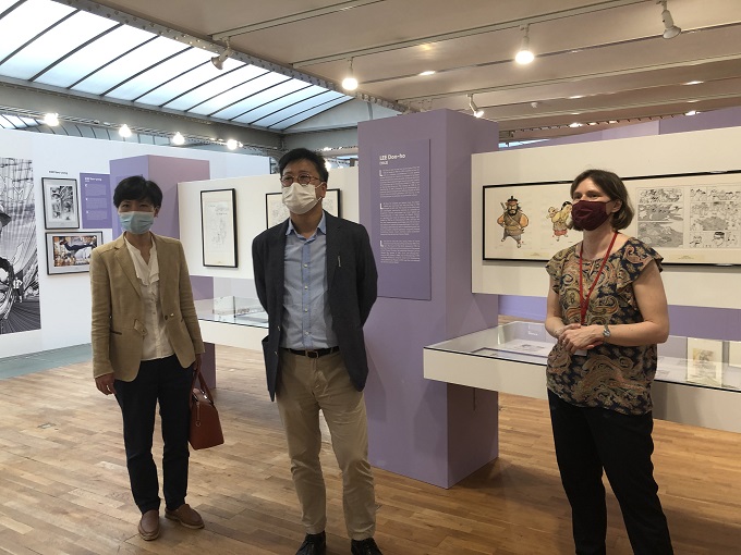 Traductrice Korean – French, Mr. Kim Jae Hwan, directeur attaché culturel du Korean Center Bruxelles et Mélanie Andrieu, commissaire de l’exposition "Manhwa & webtoon - l'envol de la bande dessinée coréenne"au C.B.B.D