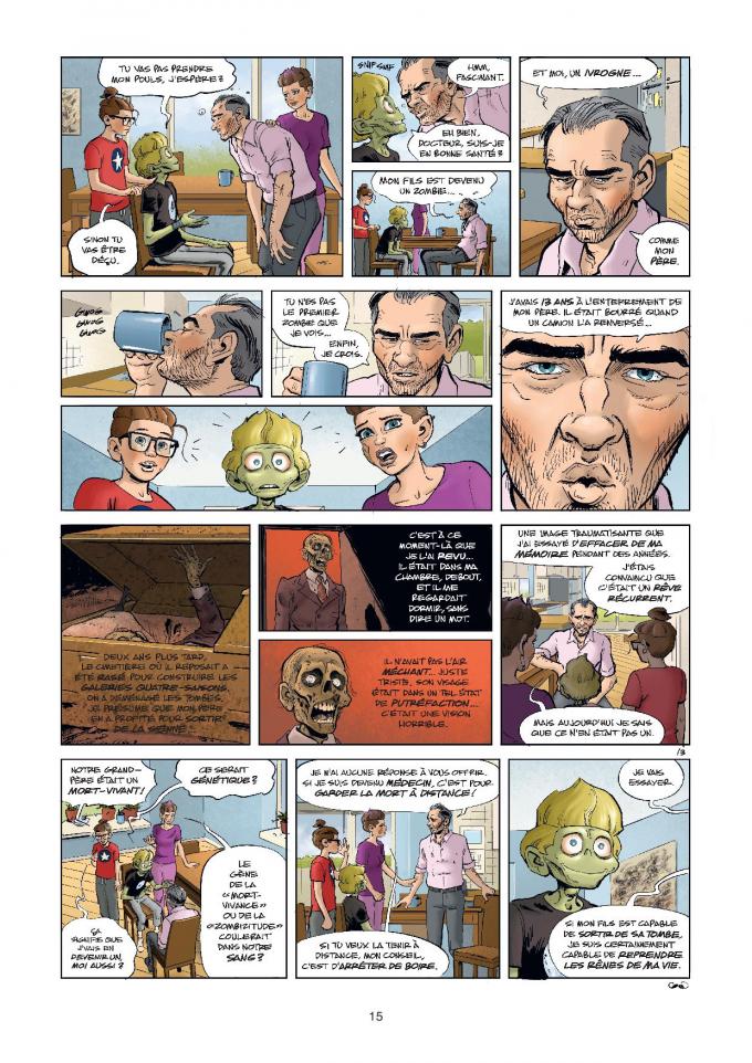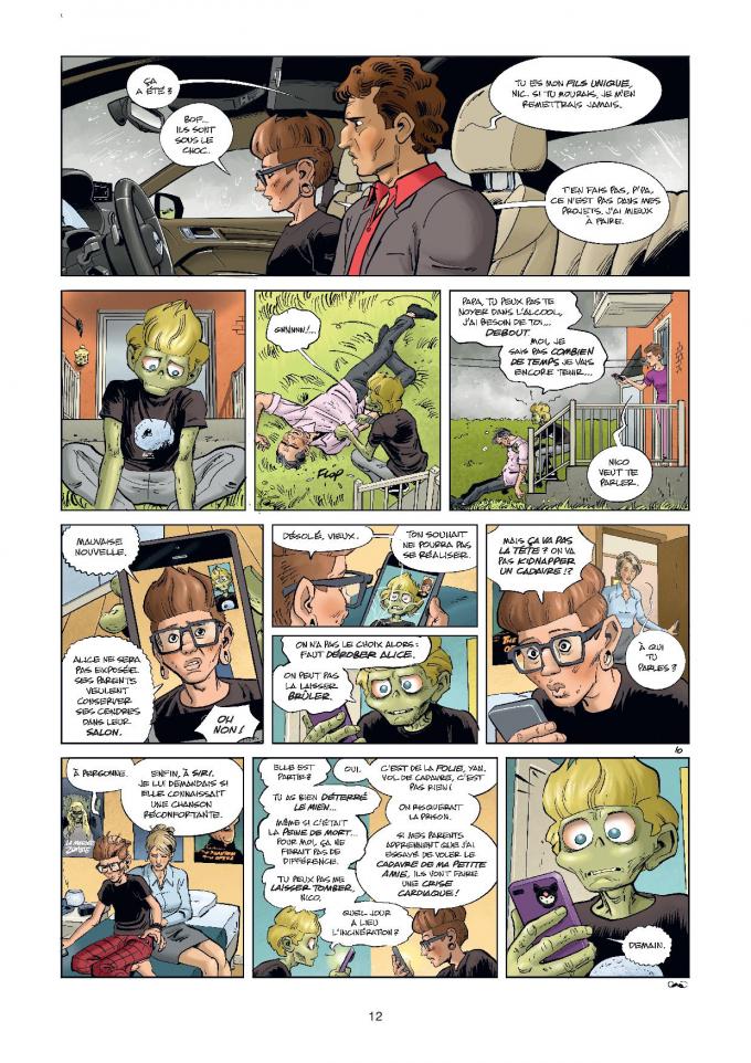 Yan retrouve sa famille. Ses parents sont tout étonnés de le revoir. Et pour cause, il est mort depuis un bon moment. Son retour n’a pas l’air d’être leur principal sujet de préoccupation. La famille est en pleine déliquescence. Son père est alcoolique au plus haut point. Sa mère s’est trouvé un nouveau compagnon. Alors, un fils qui ressuscite, on s’en occupera plus tard. Pour, Yan et Nicolas, c’est une course contre la montre qui commence. Alice a été tuée. Elle doit être incinérée. Il faut absolument empêcher ça sinon elle ne pourra jamais se « zombifier ». Et quand l’amant de la maman de Yan va apprendre que le fils de sa chérie est celui sur qui il a tiré, il va … perdre la boule.