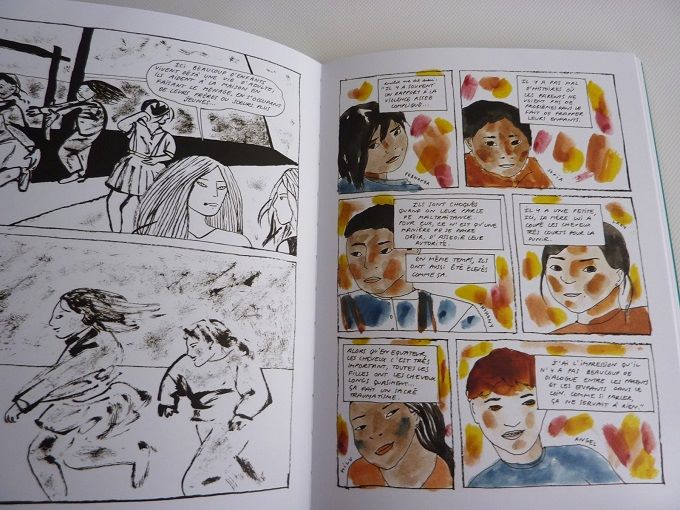 Les partis pris graphiques d’Isatis n’ont pas de logique. En couleurs ou en noir et blanc, dans de pleines pages ou des découpages classiques, l’autrice travaille sur le vif, à l’instinct. Quelques ratures témoignent de l’instantanéité des rencontres et des moments, ancrant un peu plus le récit dans une réalité. Et au milieu, improbable, une planche réalisée par des enfants équatoriens faite lors d’un atelier retranscrit la frayeur du terremoto (tremblement de terres dévastateur) sous les feutres des enfants.