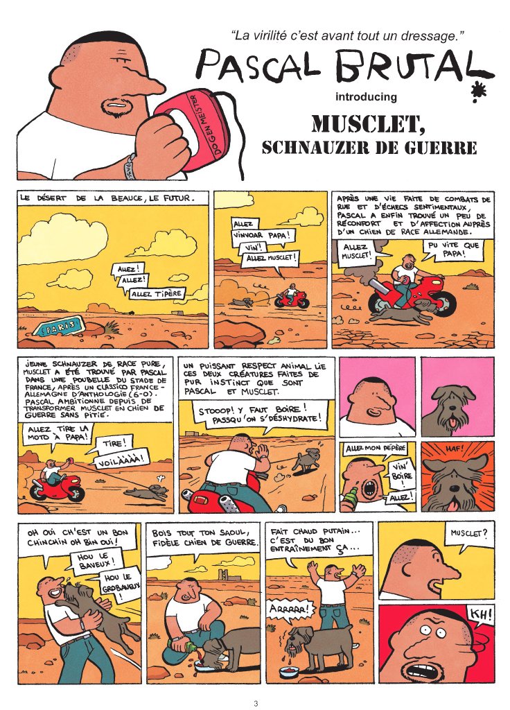 Avec Pascal Brutal, Riad Sattouf met à mal deux maux tragiques de notre société : la puissance virile et la connerie pure. Les contextes sont tirés de la France contemporaine. Le héros incarne la viridité débile. Il est le plus grand. Doté d’un physique exceptionnel, il est persuadé d’imposer le respect d’un simple regard. A travers toutes ces exagérations qui deviennent ridicules, Sattouf venge tous les gens simples et normaux. Graphiquement simple, c’est drôle et actuel. Mais à ne pas mettre entre toutes les mains.